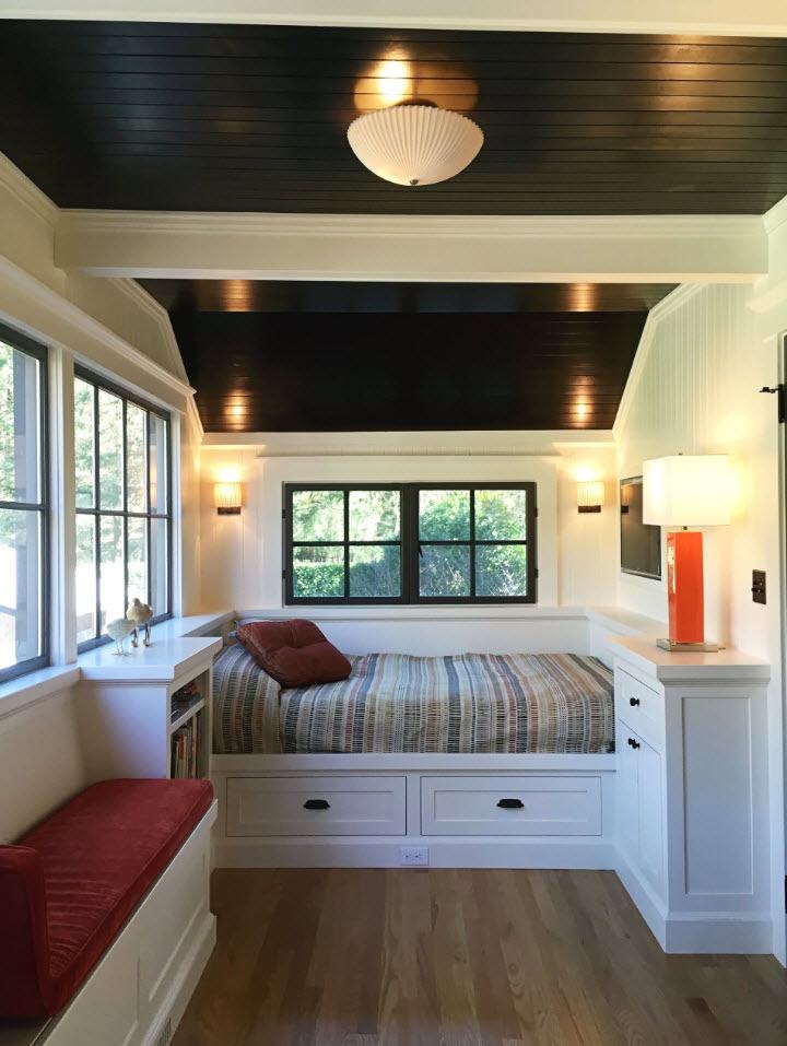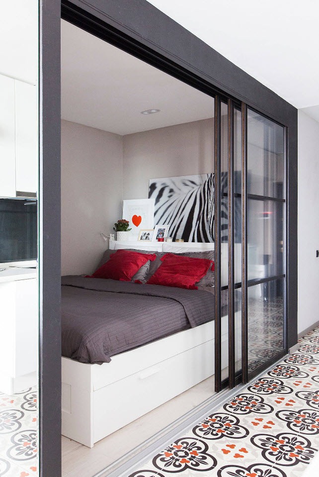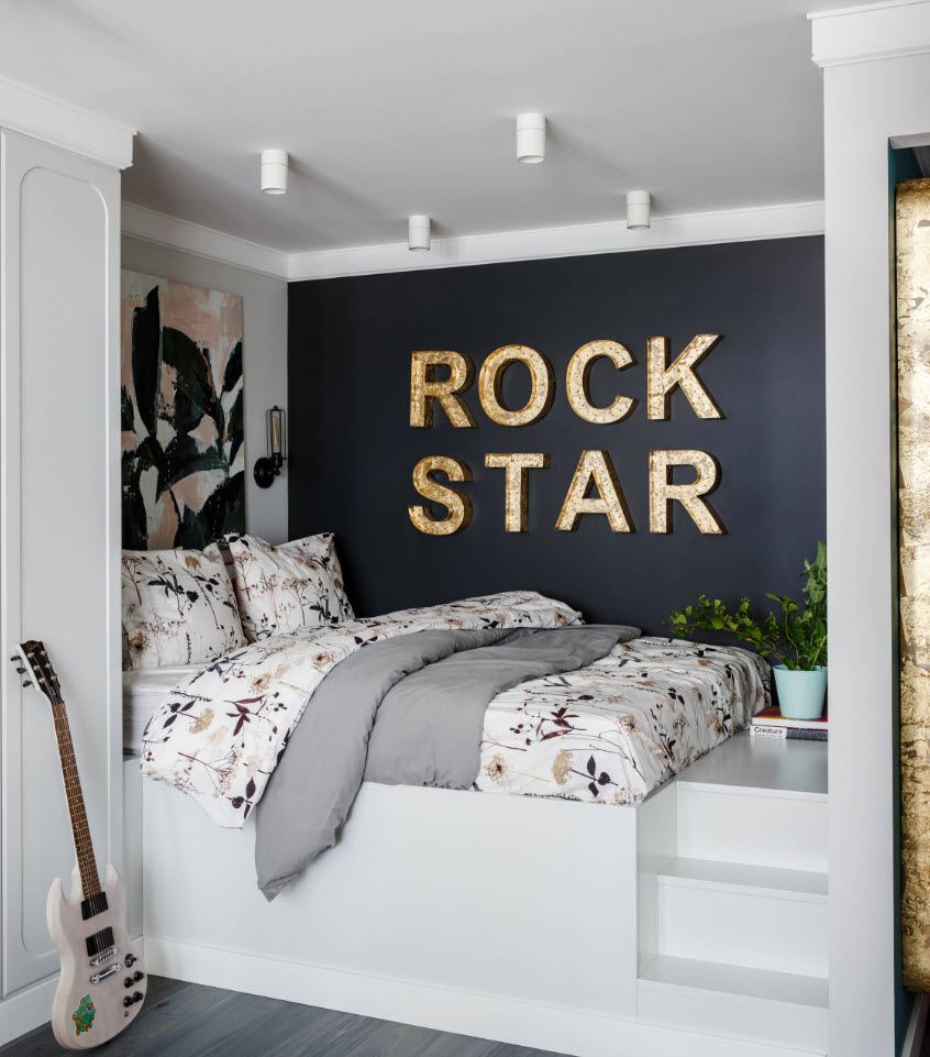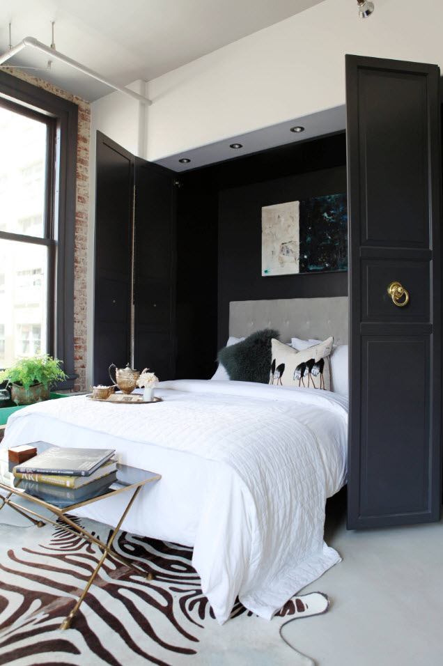 Если вы располагаете небольшой комнатой под спальню, то здесь нужно быть осторожнее с выбором цветовой гаммы. Чрезмерное количество темных тонов, как уже говорилось, визуально уменьшит пространство. Чтобы избежать этой проблемы, используйте контрастные решения.