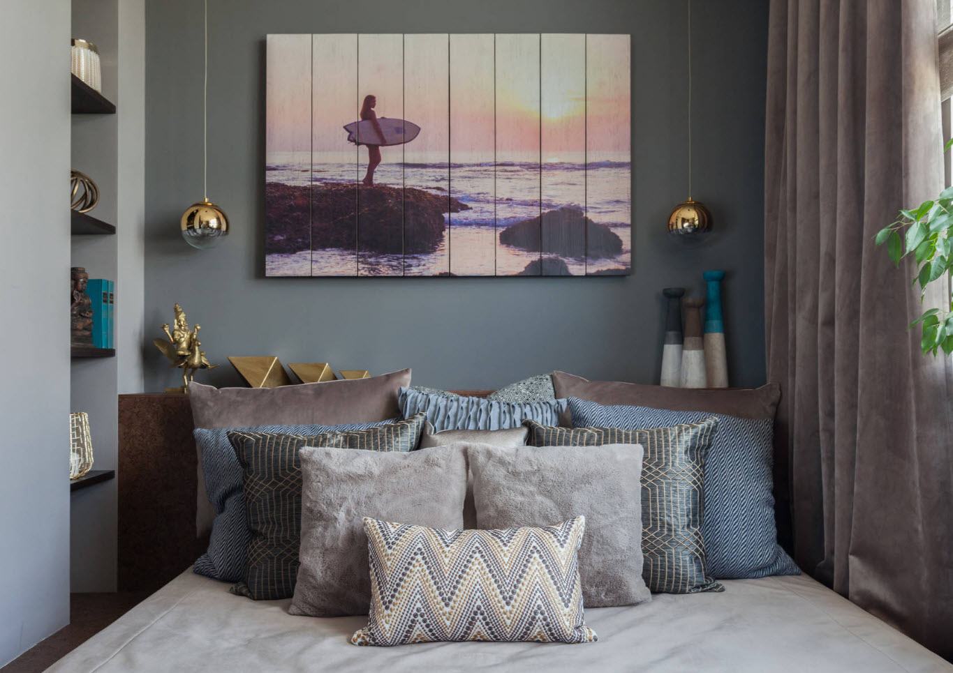 Идеальный декор изголовья кровати в спальне — бессюжетный. Это же правило применимо и к предметам декора напротив, в ногах кровати