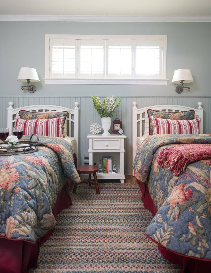 Использование двух цветов на стенах спальни может быть полезным, когда вы хотите создать уютный интерьер. Основной процедурой введения двух цветов в спальню является окраска всего интерьера в белый цвет и добавление насыщенного цвета на одной стене. Белый прекрасно гармонирует с темными оттенками, взятыми из палитры драгоценных камней, такими как изумруд, рубин, сапфир, а также черный и темно-коричневый. Другая идея — объединить стены в одной комнате в два экстремальных оттенка одного цвета — например, нежный, светло-зеленый с темно-синим, изумрудный с синеватым, светло-голубой с темно-синим. В этом случае лучше всего использовать краски от одного производителя и выбирать их из одной цветовой палитры, чтобы убедиться, что они совпадают.