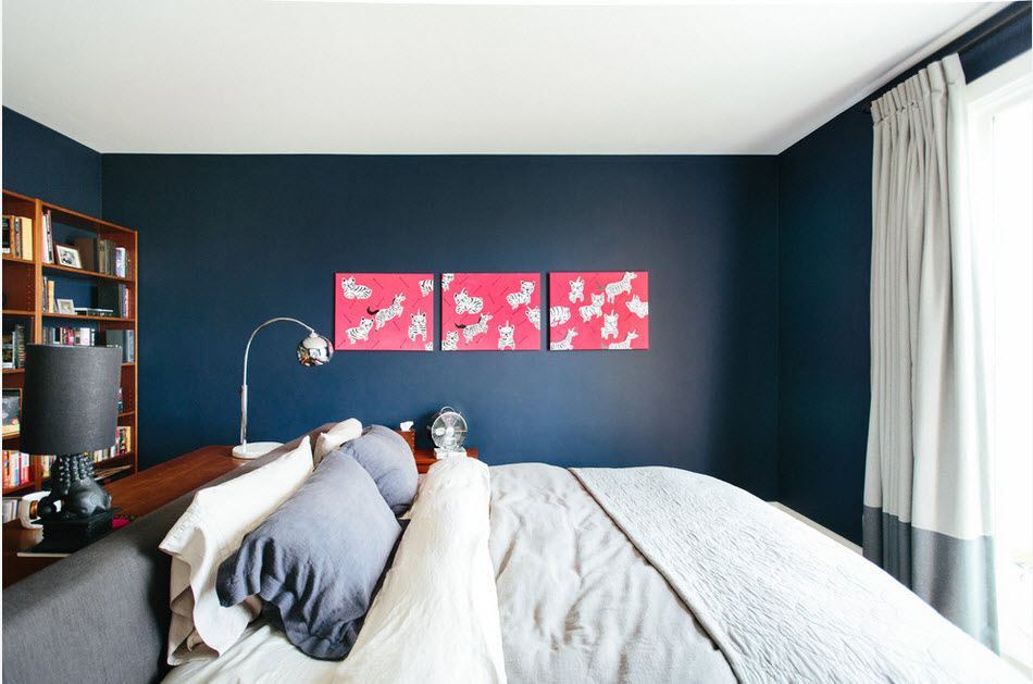 - зонирование узкой спальни с помощью отделки стен контрастными цветами, разной фактурой материалов;