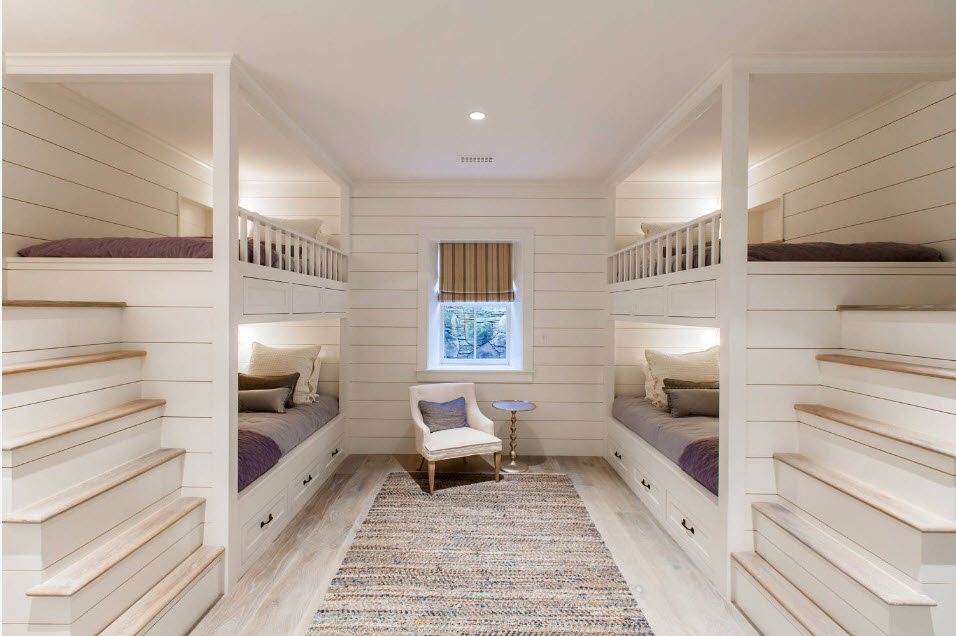 Если при расположении кровати вдоль, по бокам останется менее 70 см для каждого спального места, то кровать нужно устанавливать поперек комнаты, так как узкие проходы будут приносить вам одни неудобства. А если кровать развернуть поперек, то можно будет оставить полноценные проходы, пусть даже хотя бы к одному месту, но зато у вас освободится достаточное количество свободного пространства.