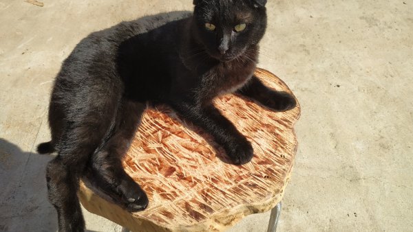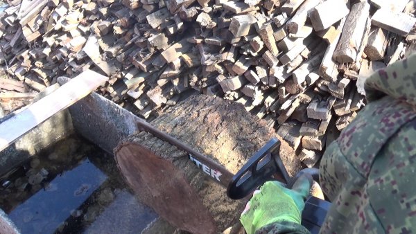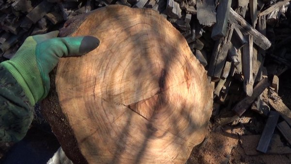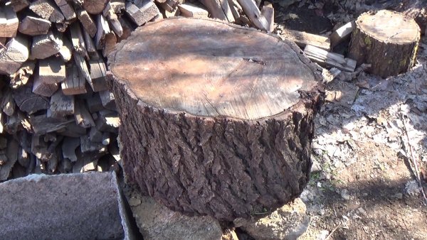 Затем нужно было определиться с сиденьем, сначала хотел сделать из обрезков доски, но потом мне на глаза попался обрезок дерева и решено было сделать из него. Кусок отпилил при помощи бензопилы.
